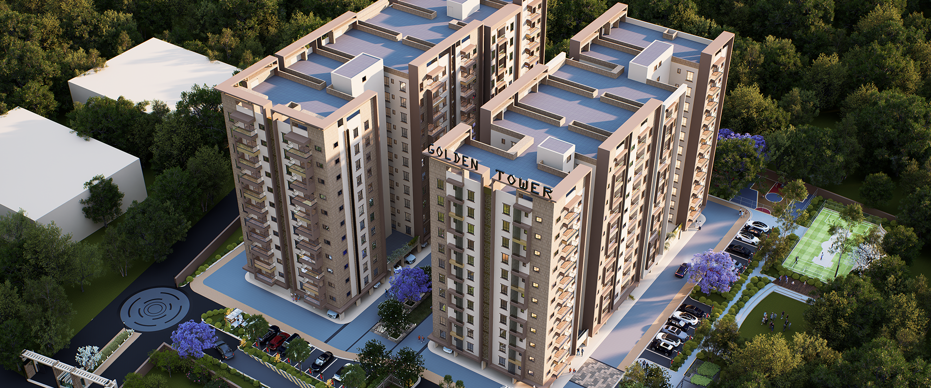 Golden Towers offers a serene retreat spread over 3 ACRES, with 2 TOWERS and 242 REFINED RESIDENCES. Experience elegance with lush greenery and thoughtfully crafted homes that invite comfort, convenience, and natural beauty.