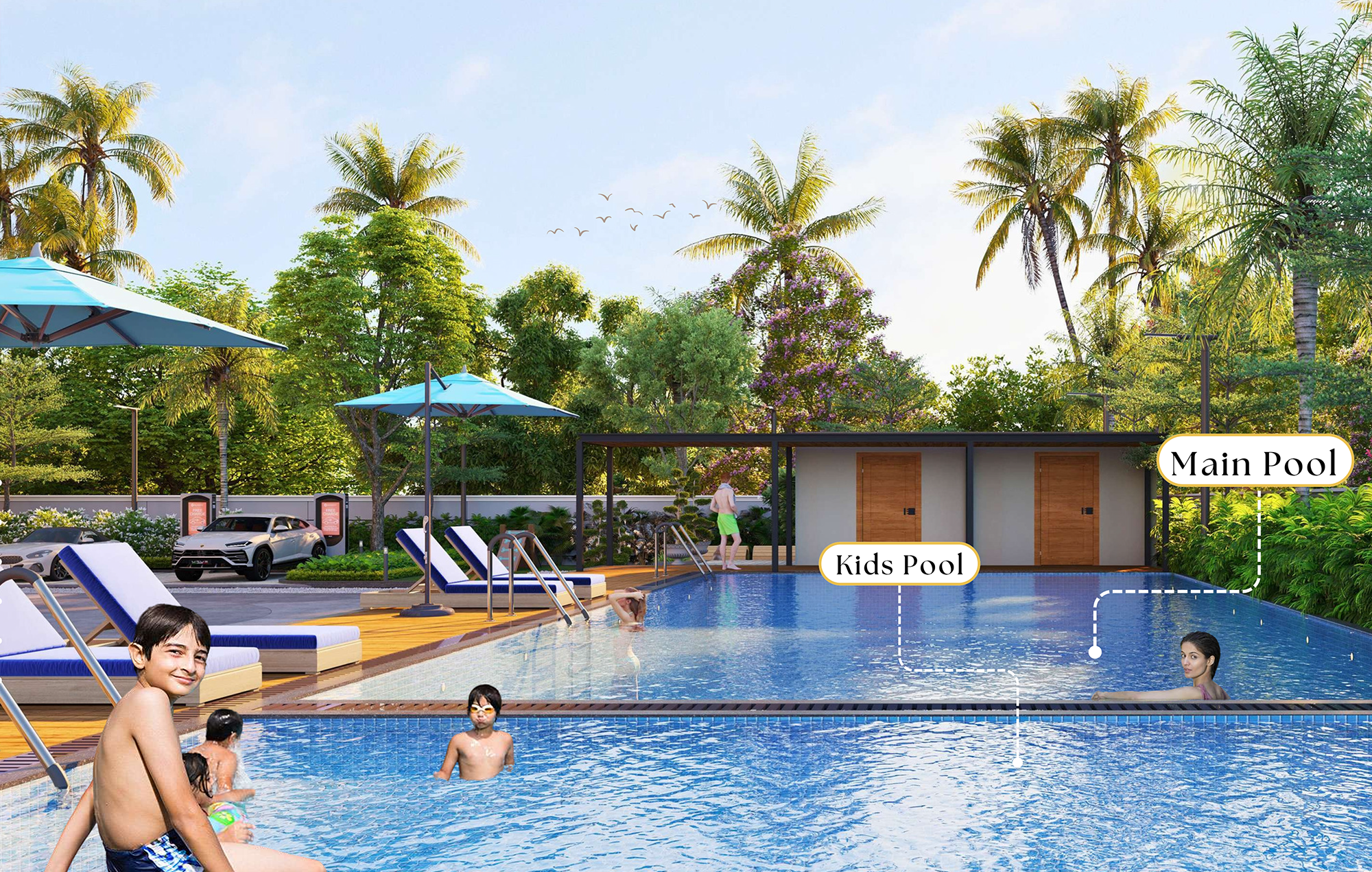 Enjoy a luxurious main pool for relaxation and fitness, while the kids pool offers a safe and fun space for little swimmers to splash and play.